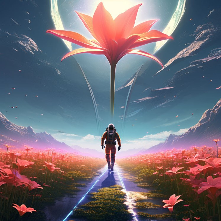 Computer generated image apps give back frustrating results. It takes a lot of trying.  They seem to be random too, if unintentionally.  It added a person in a spacesuit.  That figure took me back to a world I created last year for a story on which Dan Antion collaborated, The Inyan Beacon.  So my response to Dave’s prompts is set in that universe.