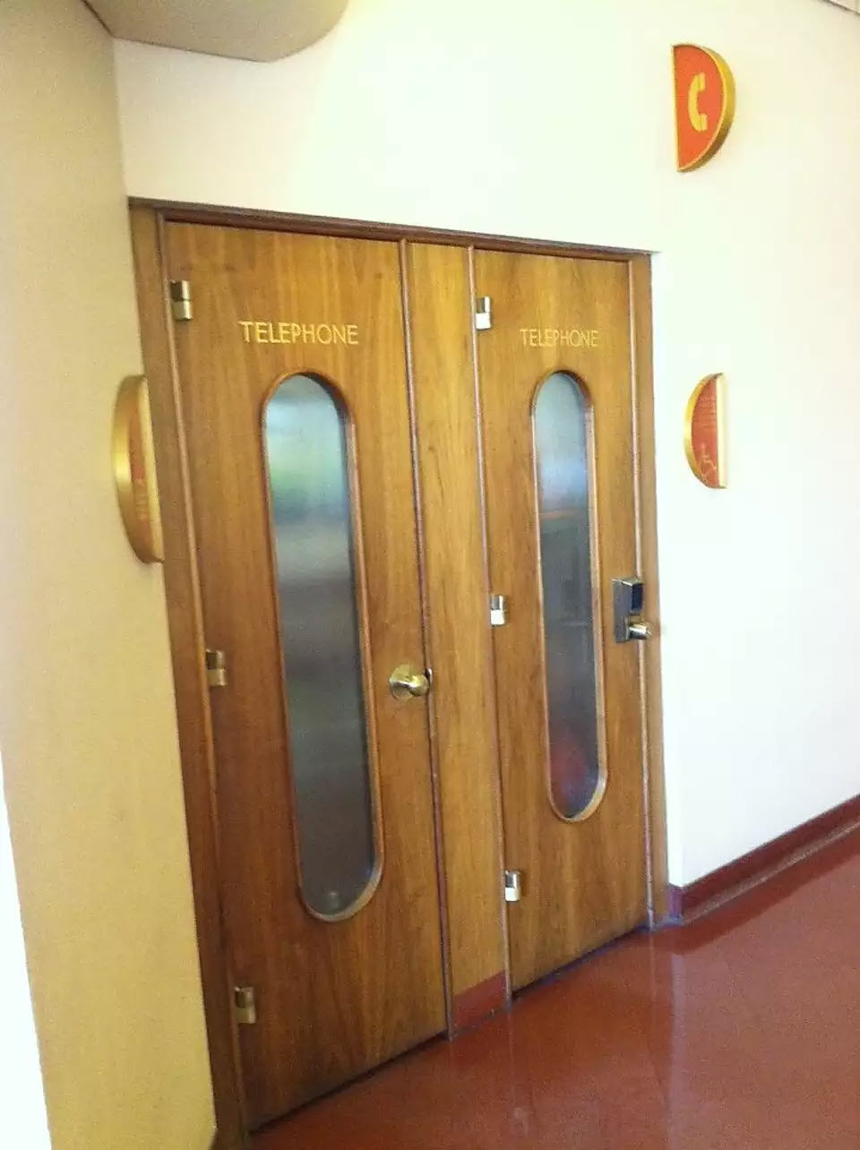Some booths were nicer than others, like the one below. Although the phones are long gone from this one in the Marin County Courthouse in San Francisco. Frank Lloyd Wright-designed building, so one would expect all the details to be nice.